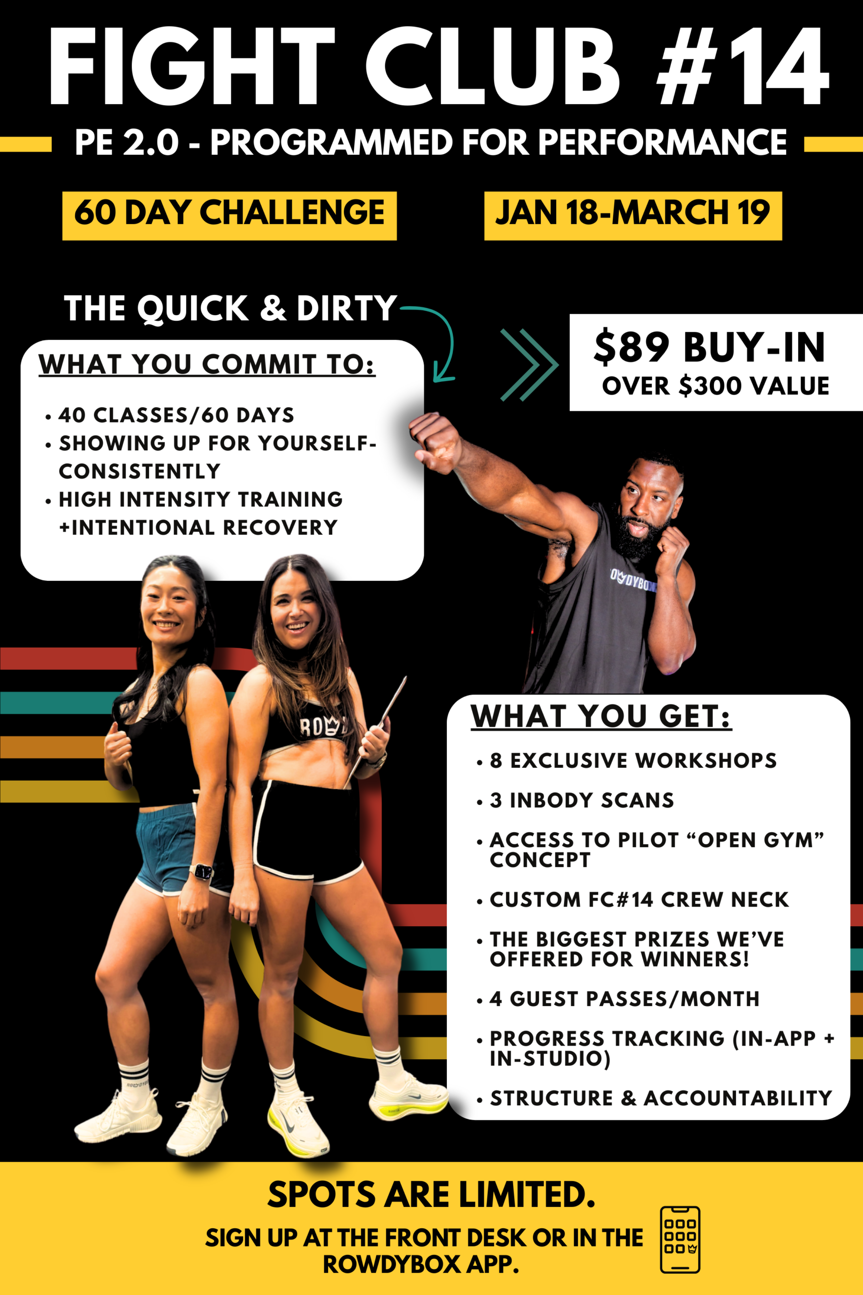 Fight Club is our 60-day challenge where you commit to a set number of classes and push yourself with the Rowdy community. The challenge: